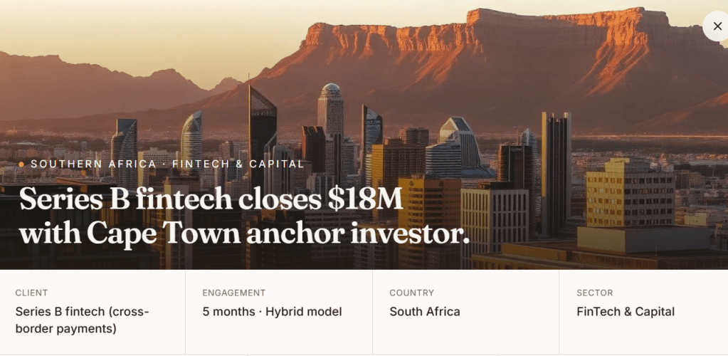 A cross-border payments fintech needed to raise a Series B anchored by a credible African investor and obtain SARB-aligned banking partnerships to operate legally across SADC. The founders had warm leads in the US and Europe but no direct access to Cape Town’s tier-1 VC ecosystem or to JSE-listed banking partners.