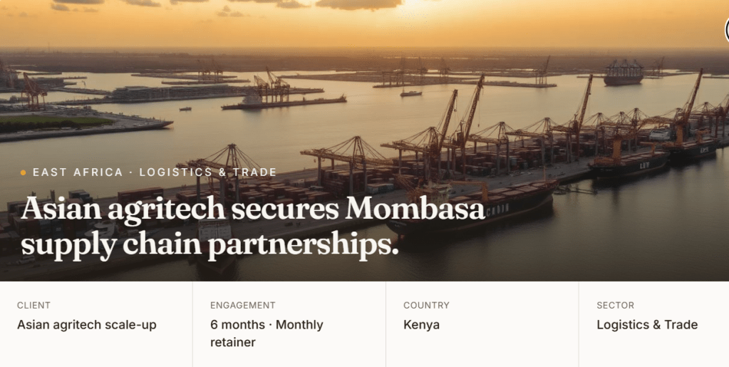 An Asian agritech scale-up needed to build a temperature-controlled supply chain from the Port of Mombasa across the East African Community. They faced fragmented logistics providers, opaque customs procedures, and no relationships with the Kenya Ports Authority — risking spoilage rates above 20% and unsustainable unit economics.
